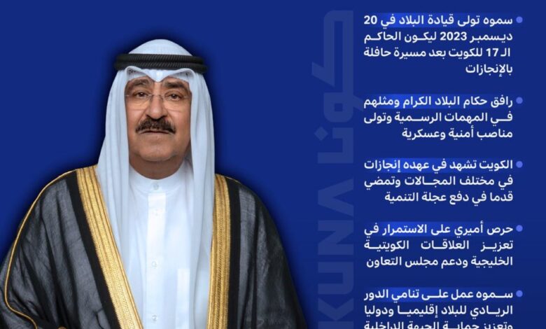 وفي ال20 من ديسمبر عام 2023 تولى سموه رعاه الله مقاليد الحكم ليكون الحاكم الـ17 للكويت بعد مسيرة حافلة بالإنجازات استمرت ستة عقود تولى خلالها مناصب أمنية وعسكرية قبل تزكيته وليا للعهد إضافة إلى مرافقة سموه لحكام البلاد الكرام أو تمثيلهم في العديد من الزيارات والمهمات الرسمية.